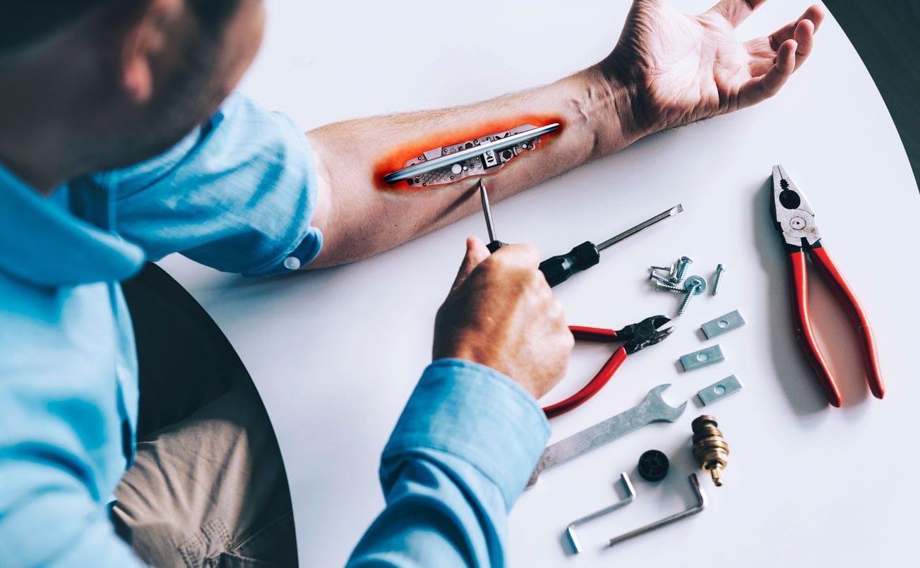 Dat apparaat past mooi in een al wat langer gaande Silicon Valley-traditie van de quantified self, waarbij mensen (vaak de standaard ietwat nerdy startuptypes) zo veel mogelijk data over hun lichaam in kaart brengen, om zo beter te begrijpen hoe het werkt en hoe die werking verbeterd kan worden. Meten is weten! De quantified self-beweging vloeit vervolgens naadloos door richting biohacking, het verbeteren van je lichaam met technologie, door specifieke bacteriën tot je te nemen en zo verder. Hoor ik daar een cyborg?
